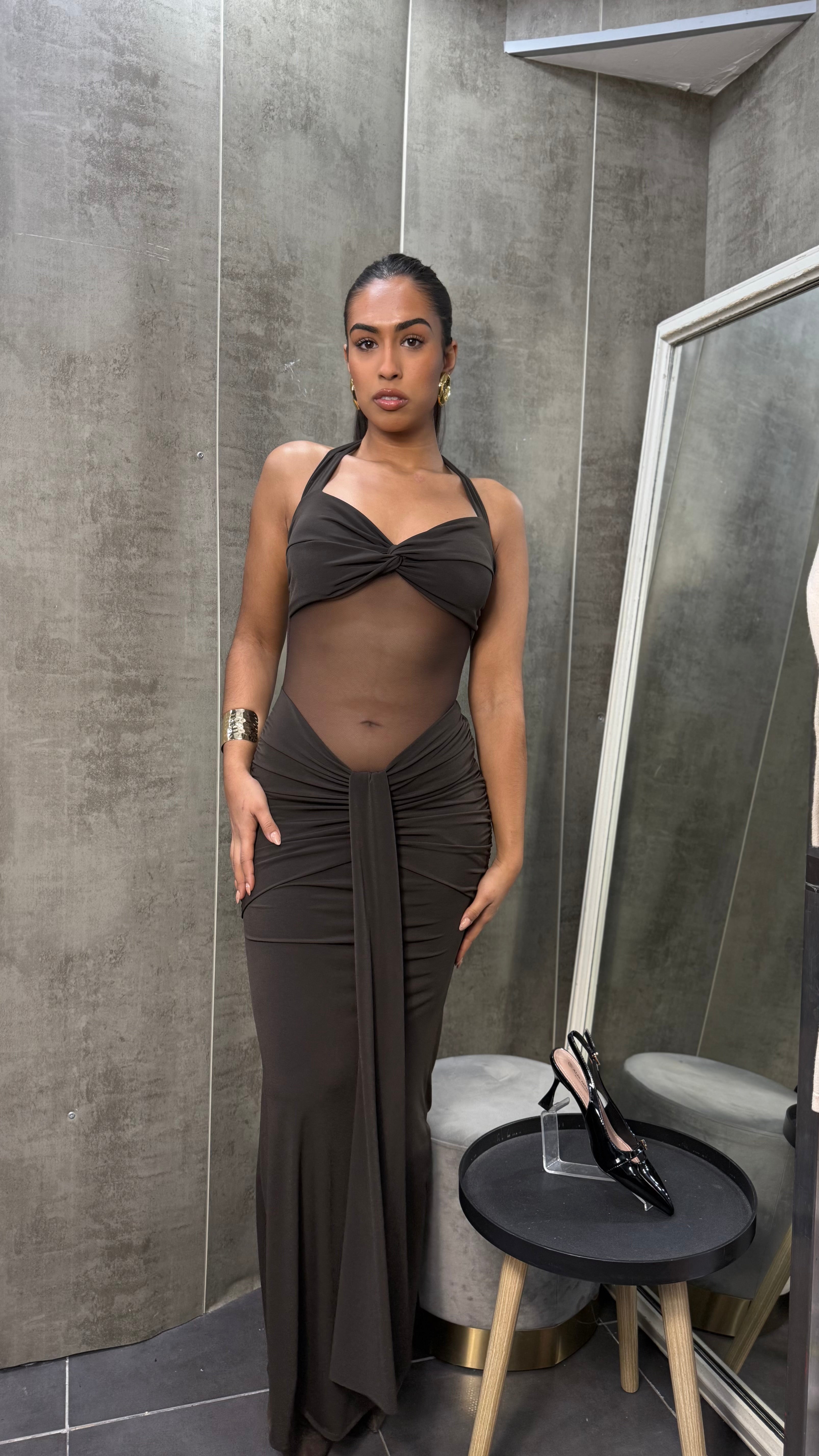 VESTIDO VOLANTE LENTEJUELAS MARRÓN