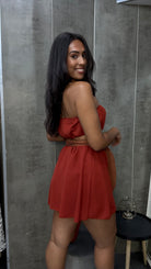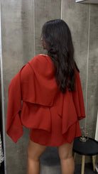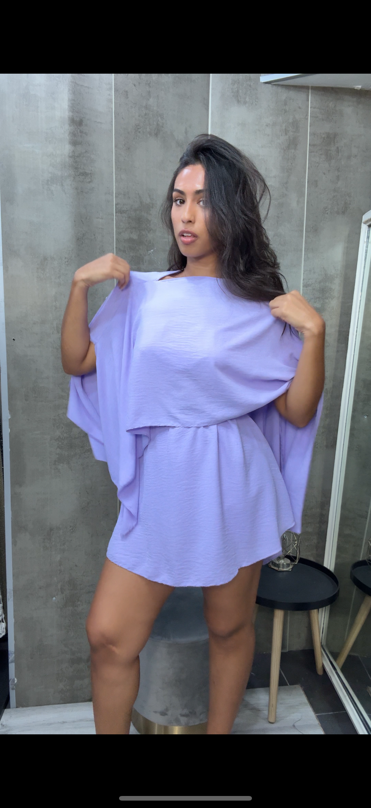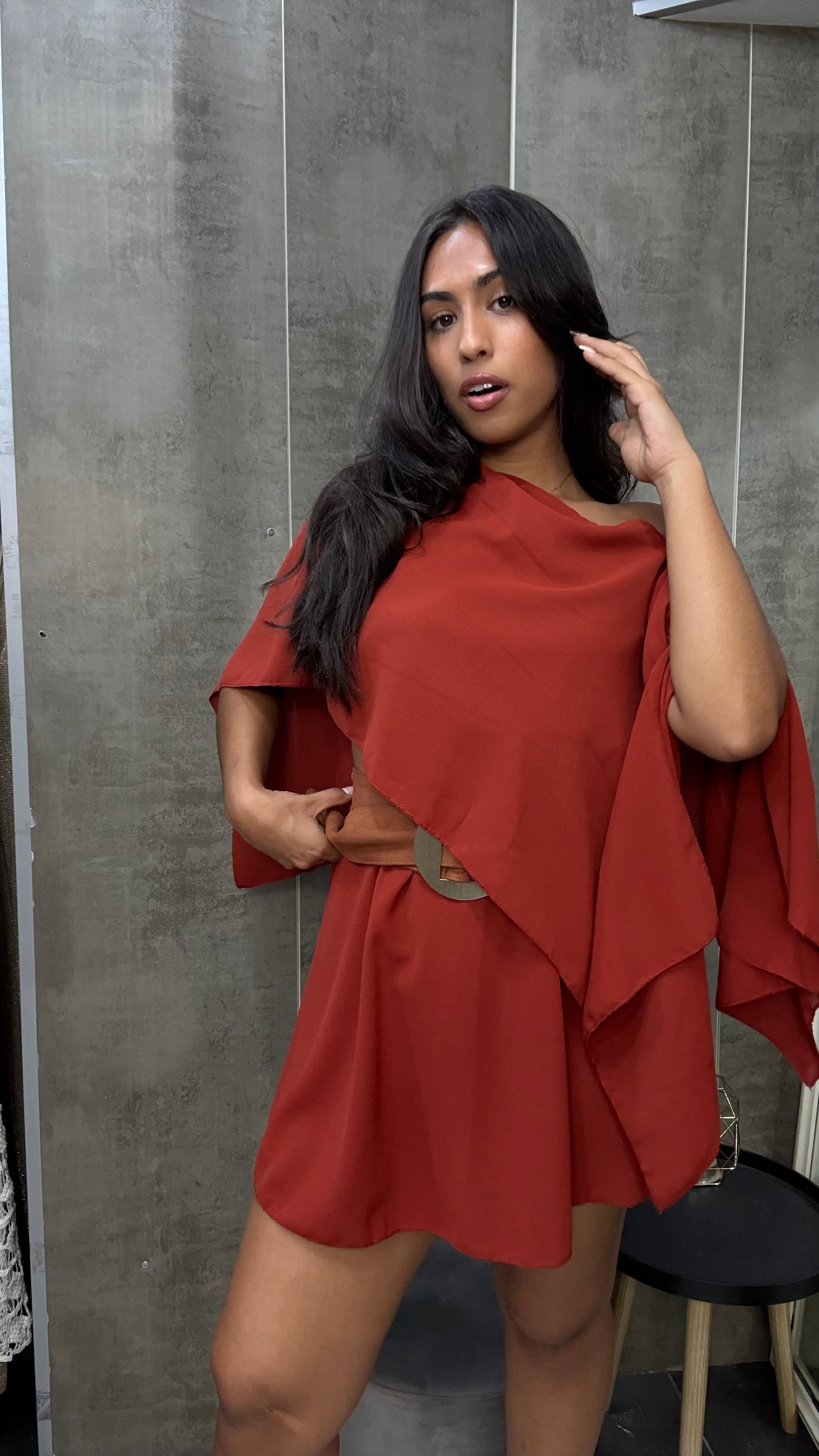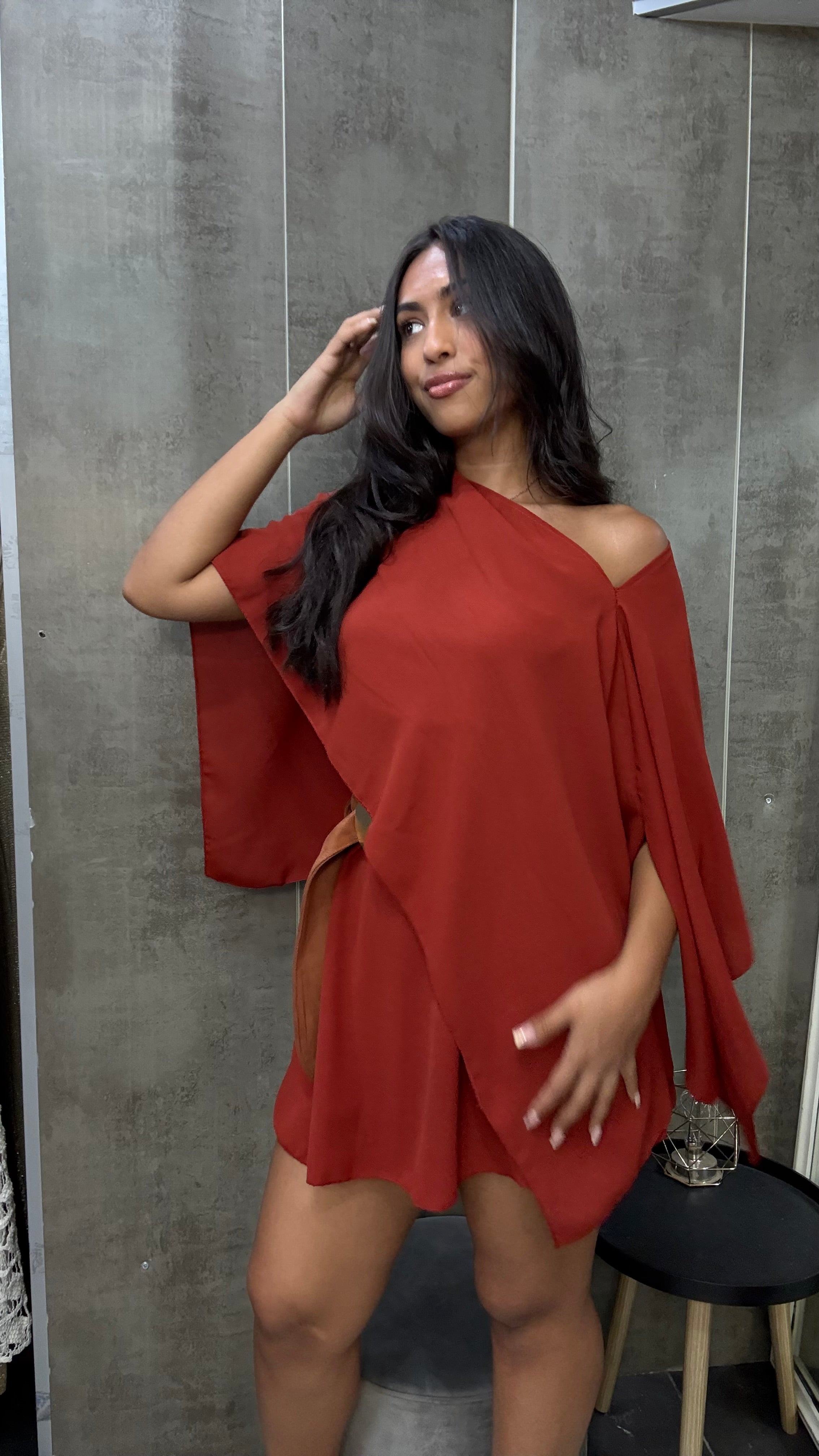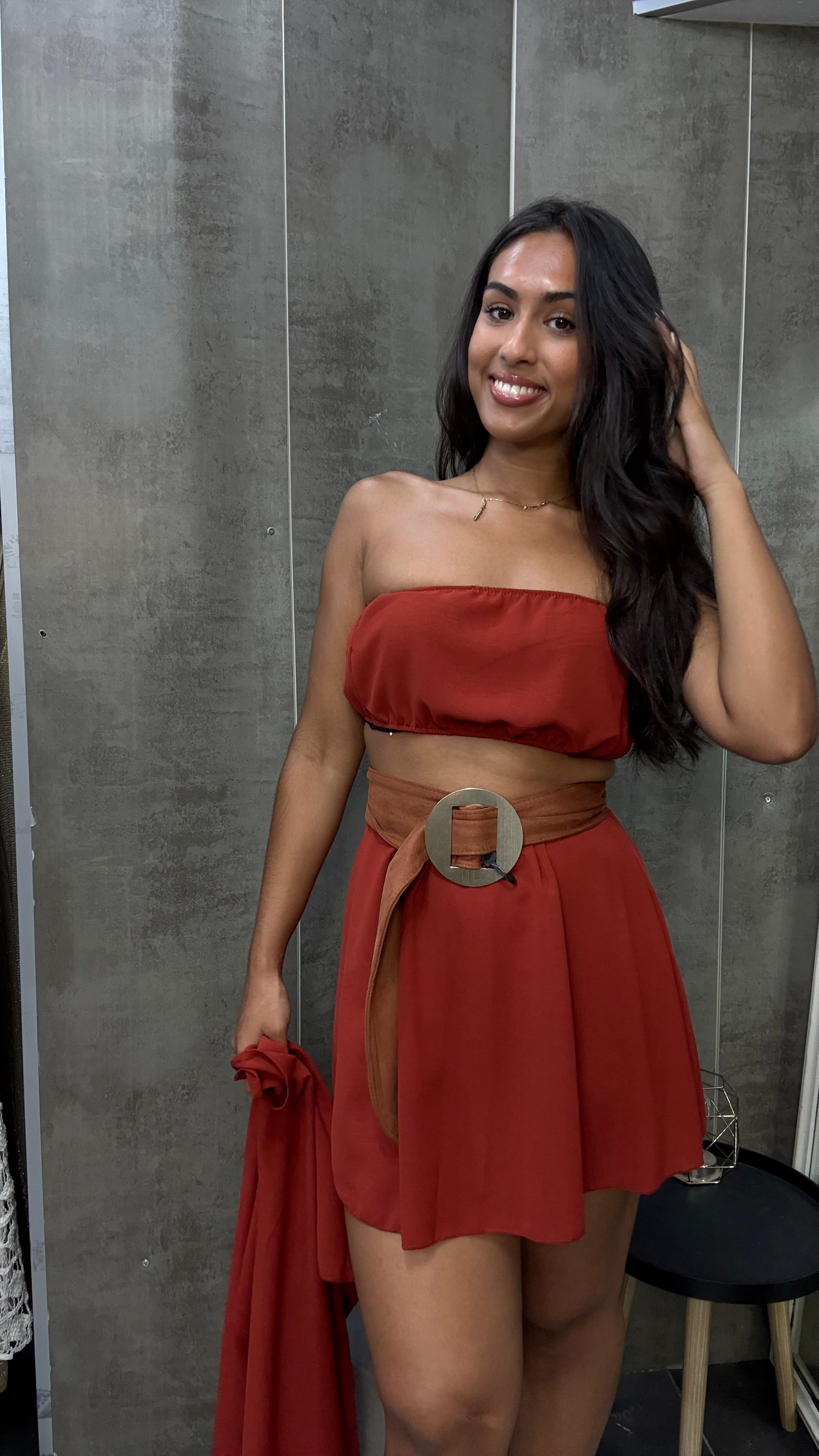 Conjunto con Top de banda pantalón estilo faldita y capa.