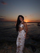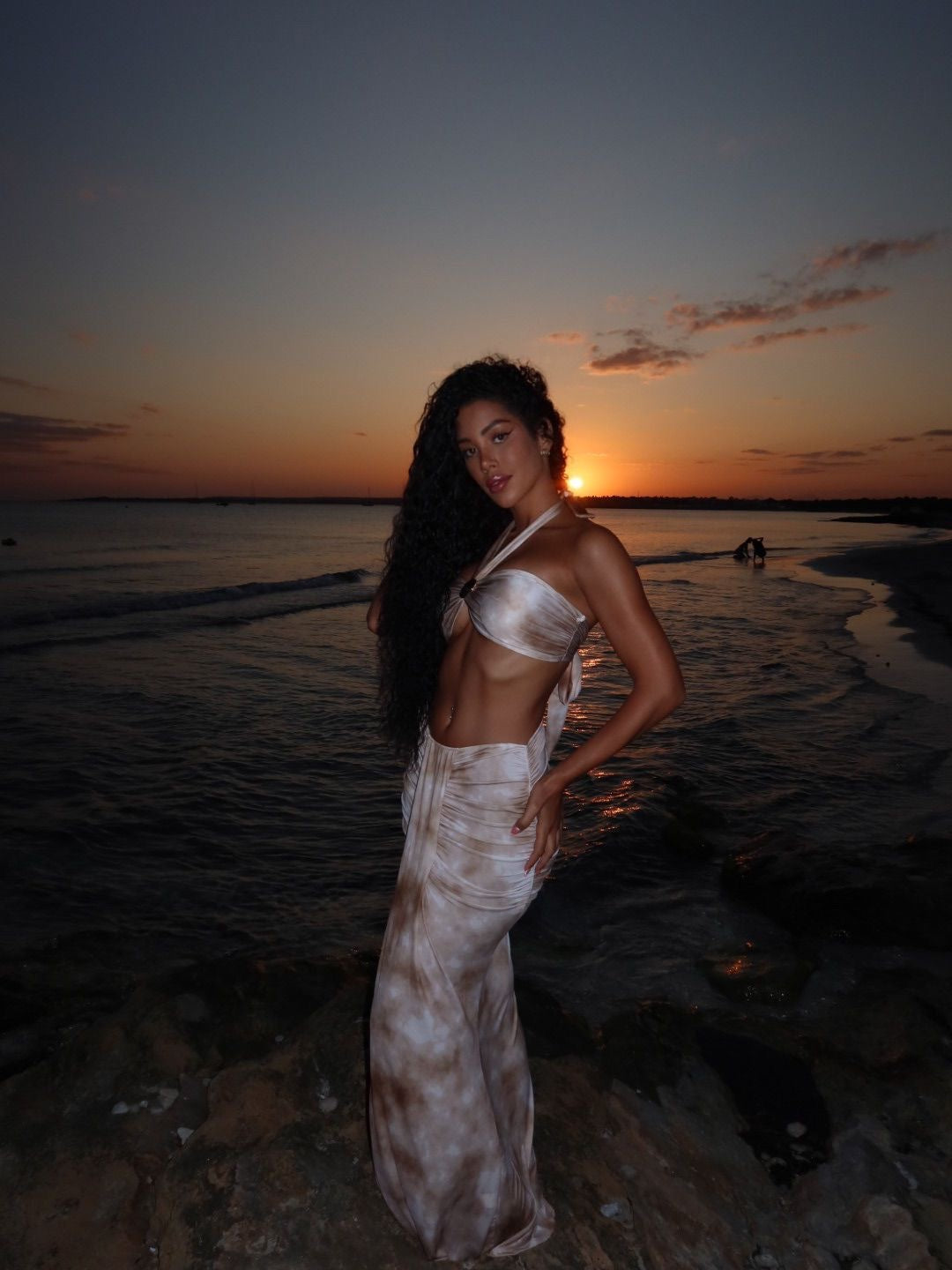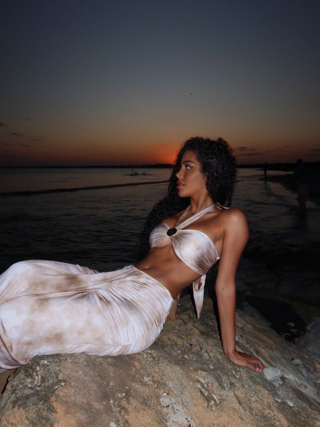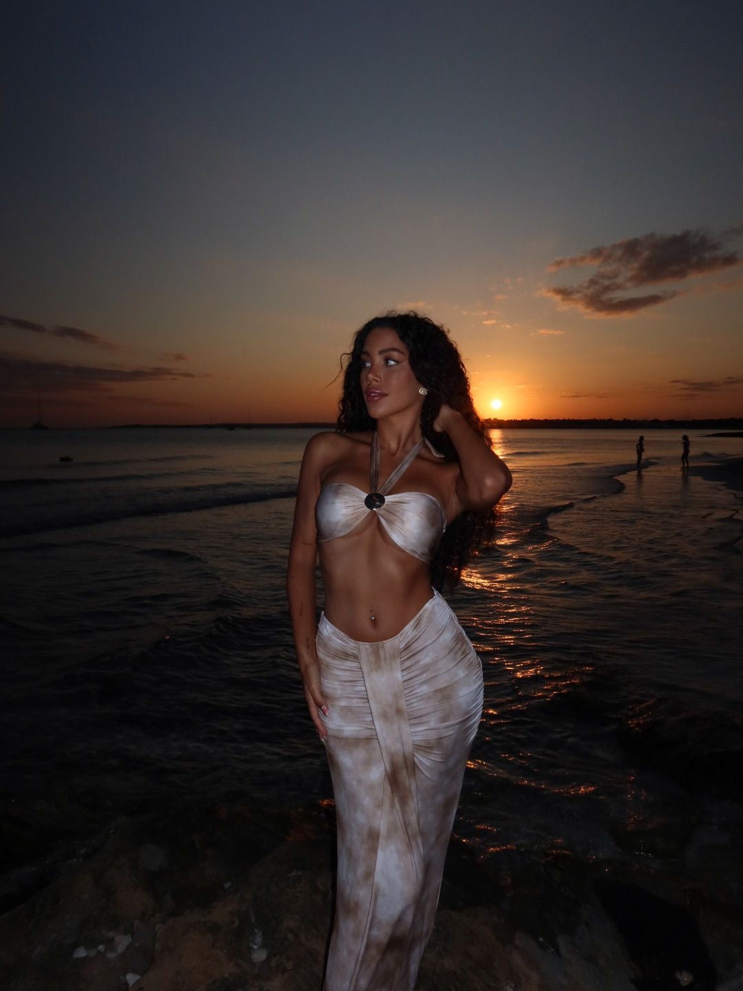 Conjunto de 3 piezas incluye top con anilla central, falda pareo fruncidada con caída y parte de bikini a juego.
