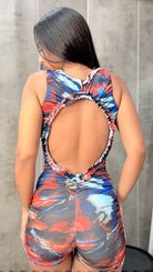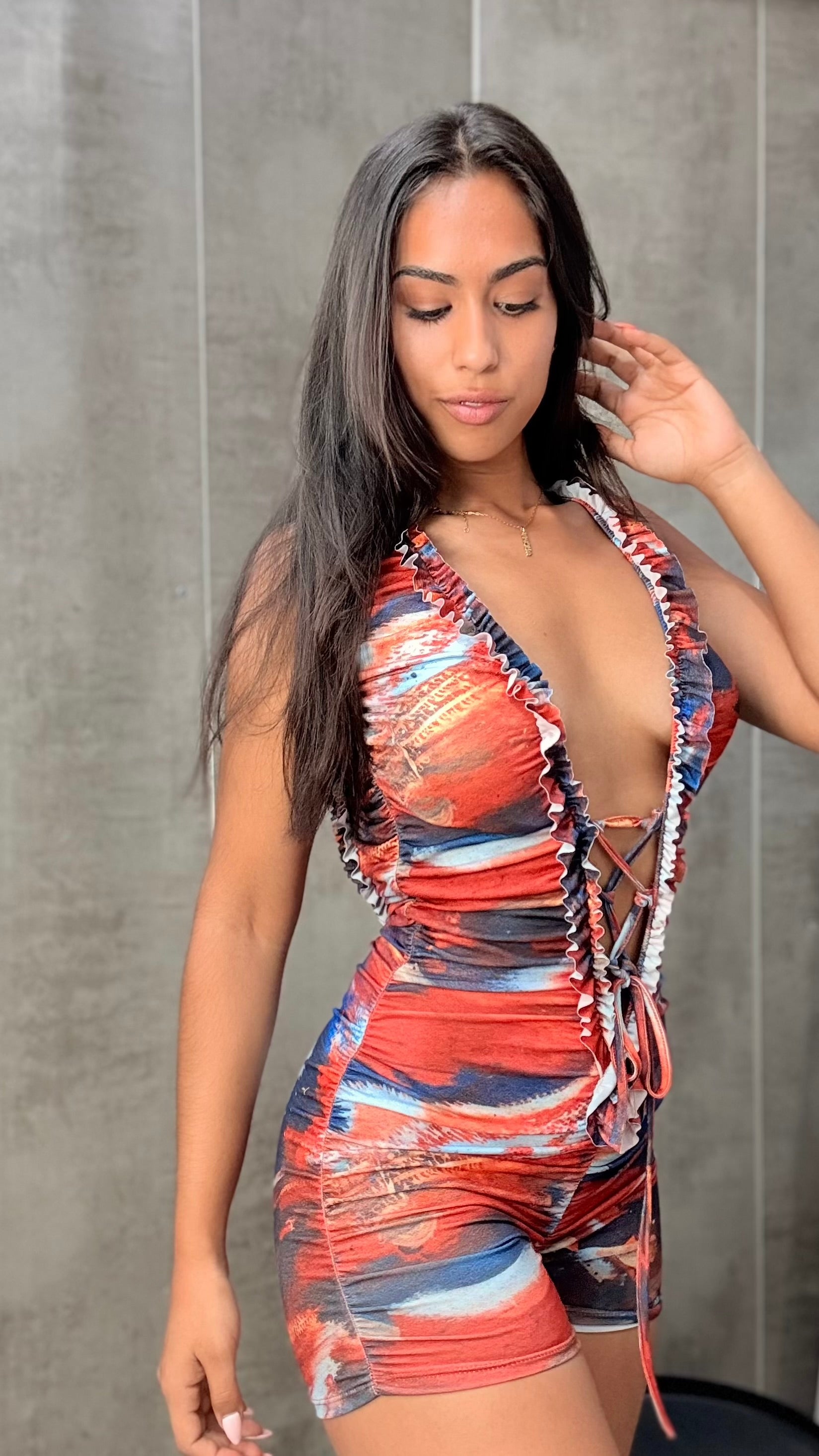 Mono corto con estampado en tonos tierra, fruncido en el pecho con detalle de cordones cruzados y espalda completamente descubierta.