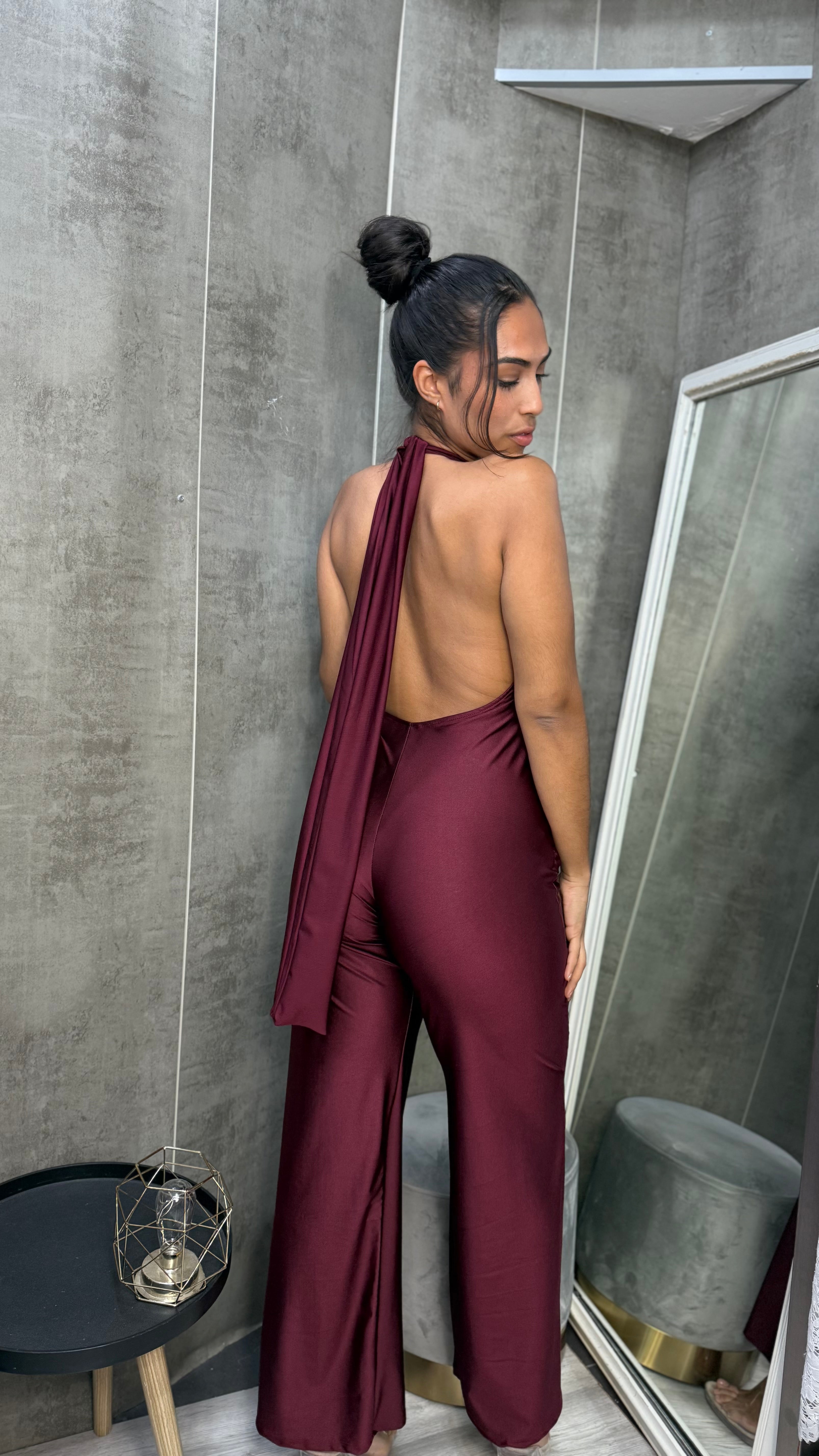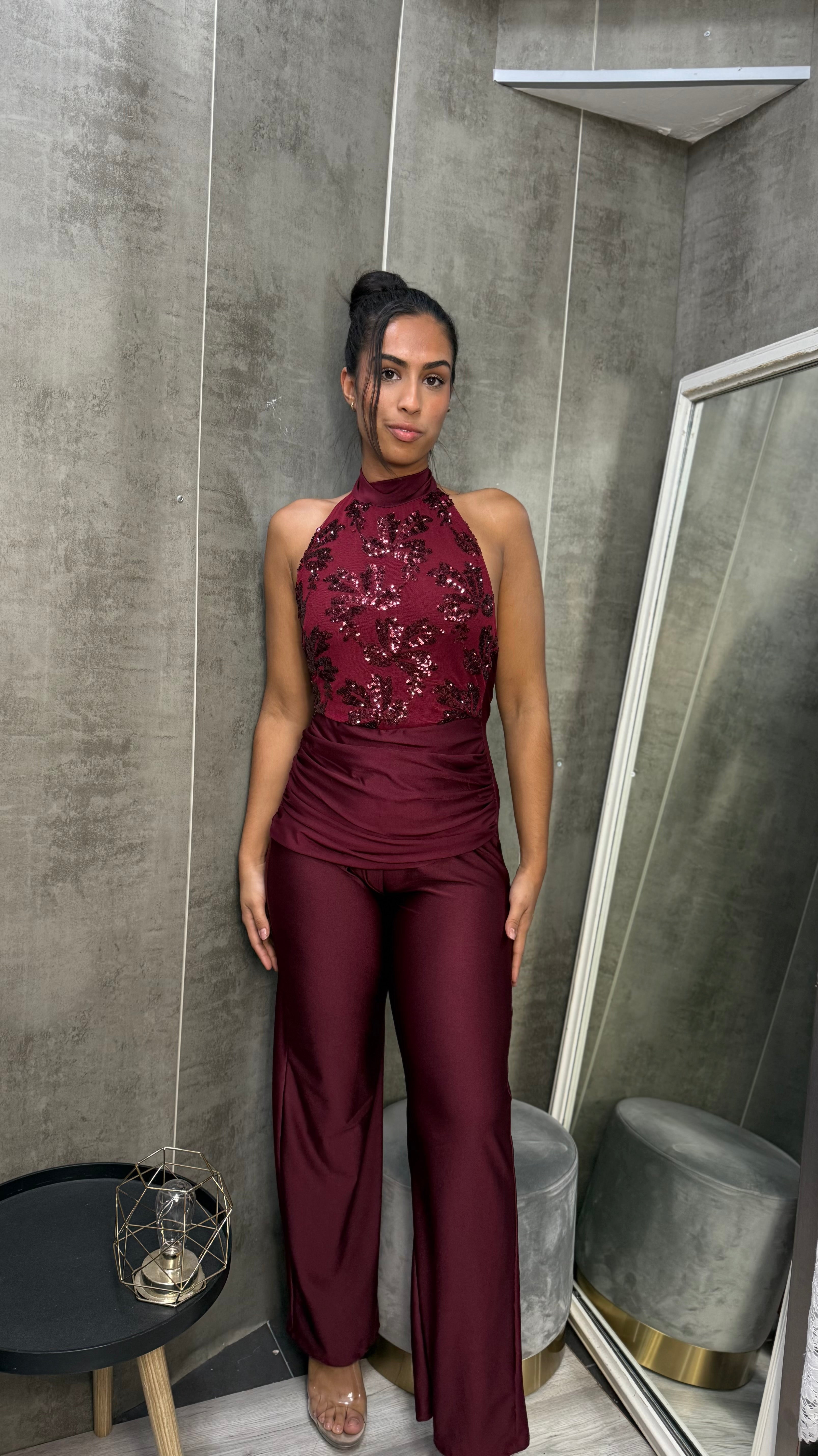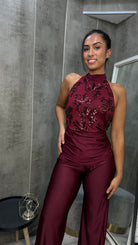 Mono con escote Halter, decorado en la parte superior con lentejuelas.