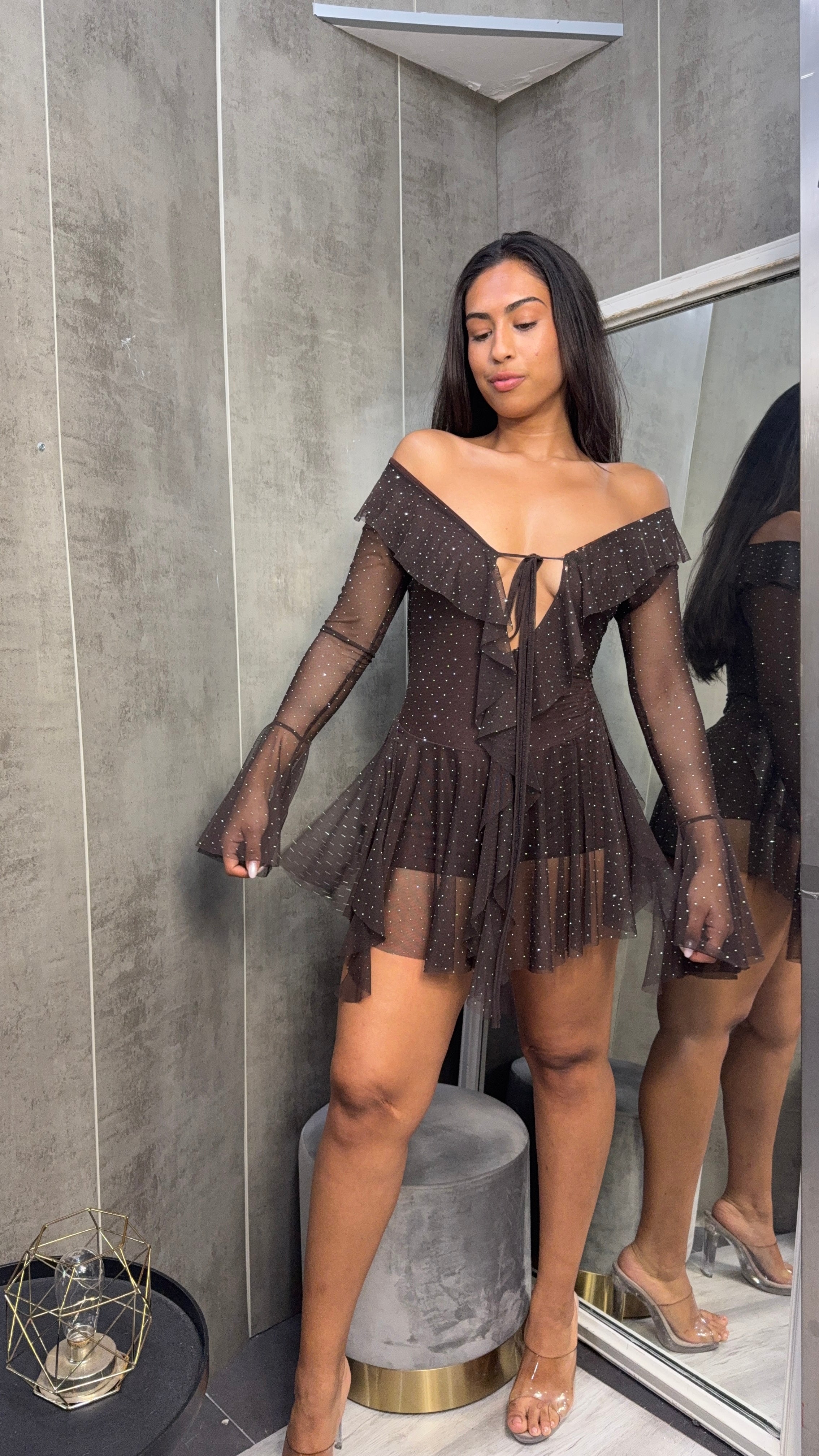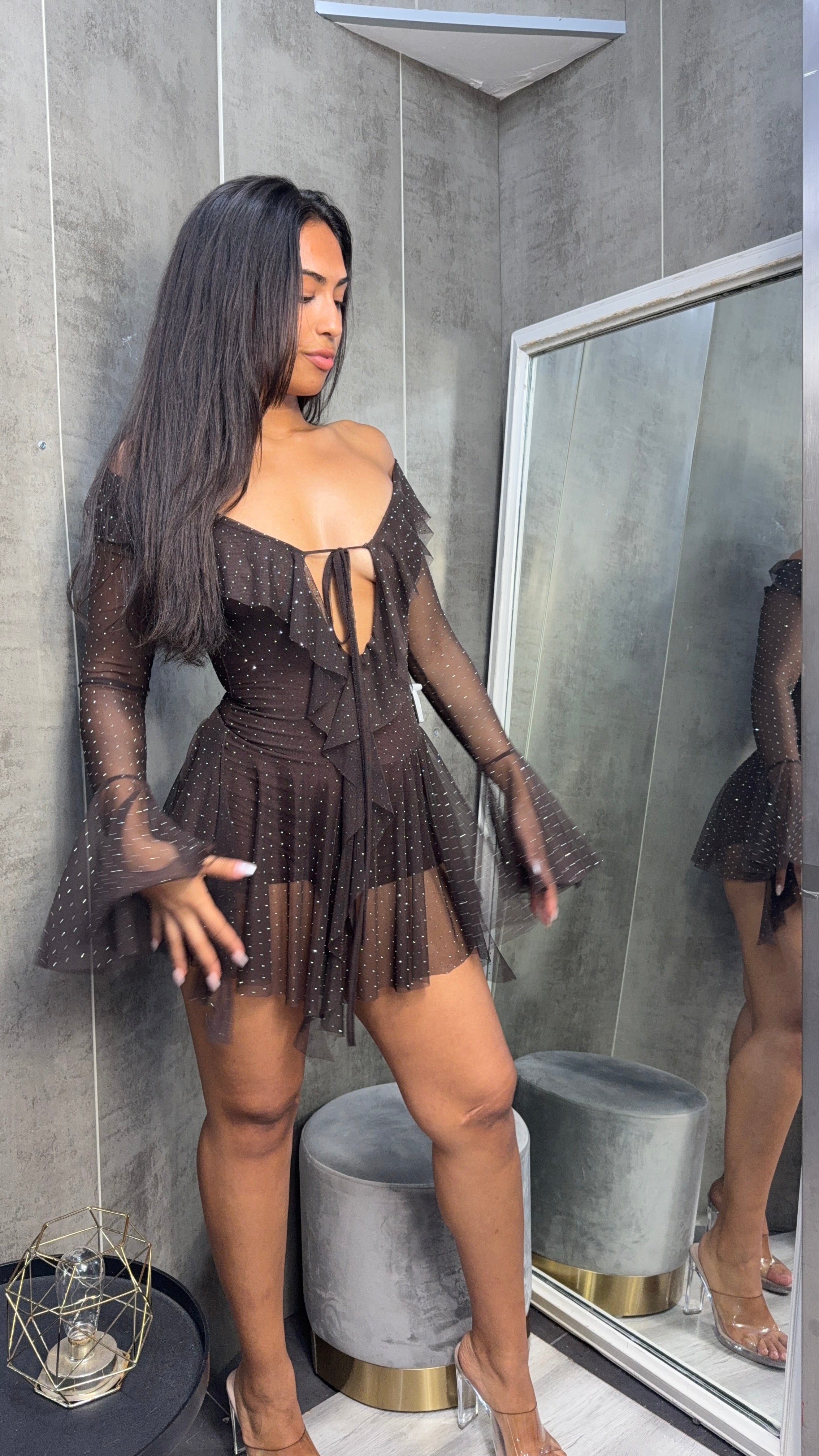 Vestido corto con transparencias, volantes y detalle de lazada al frente.