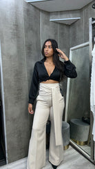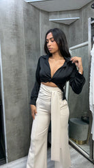 Pantalón tiro alto con decorado anudado en la parte superior.