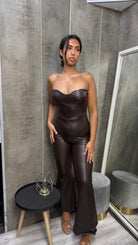 Mono efecto cuero con escote palabra de honor.