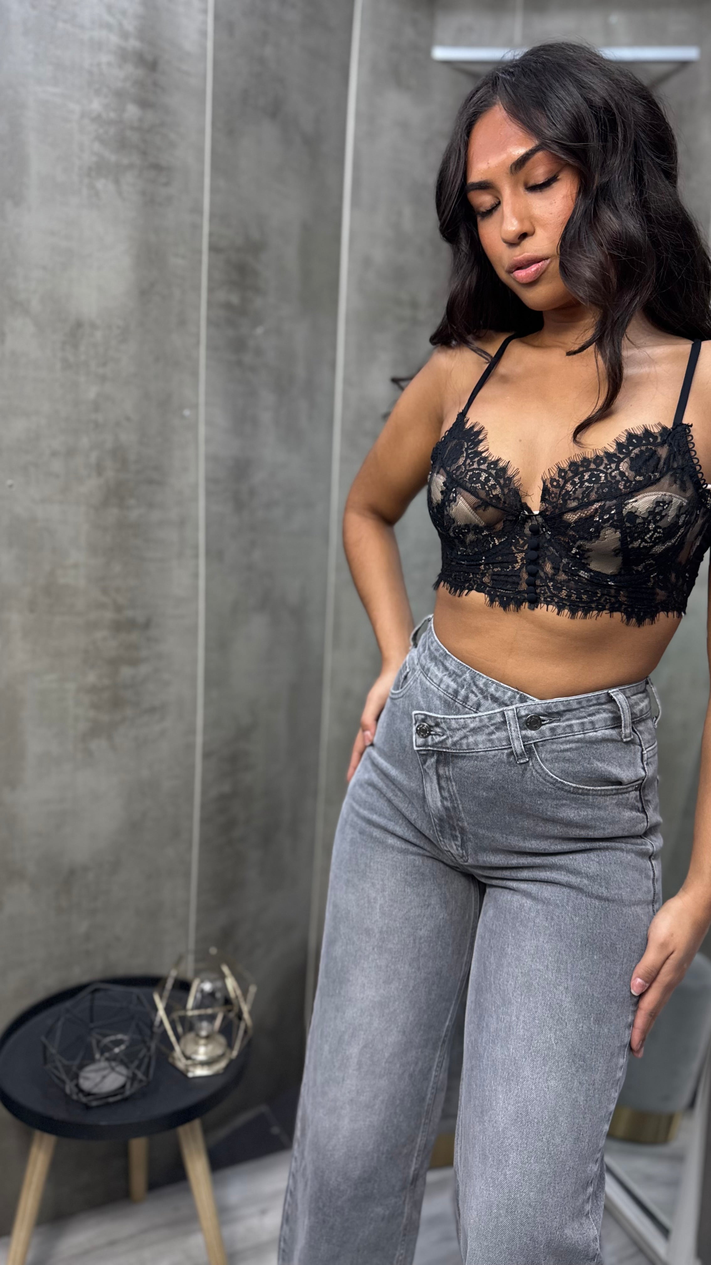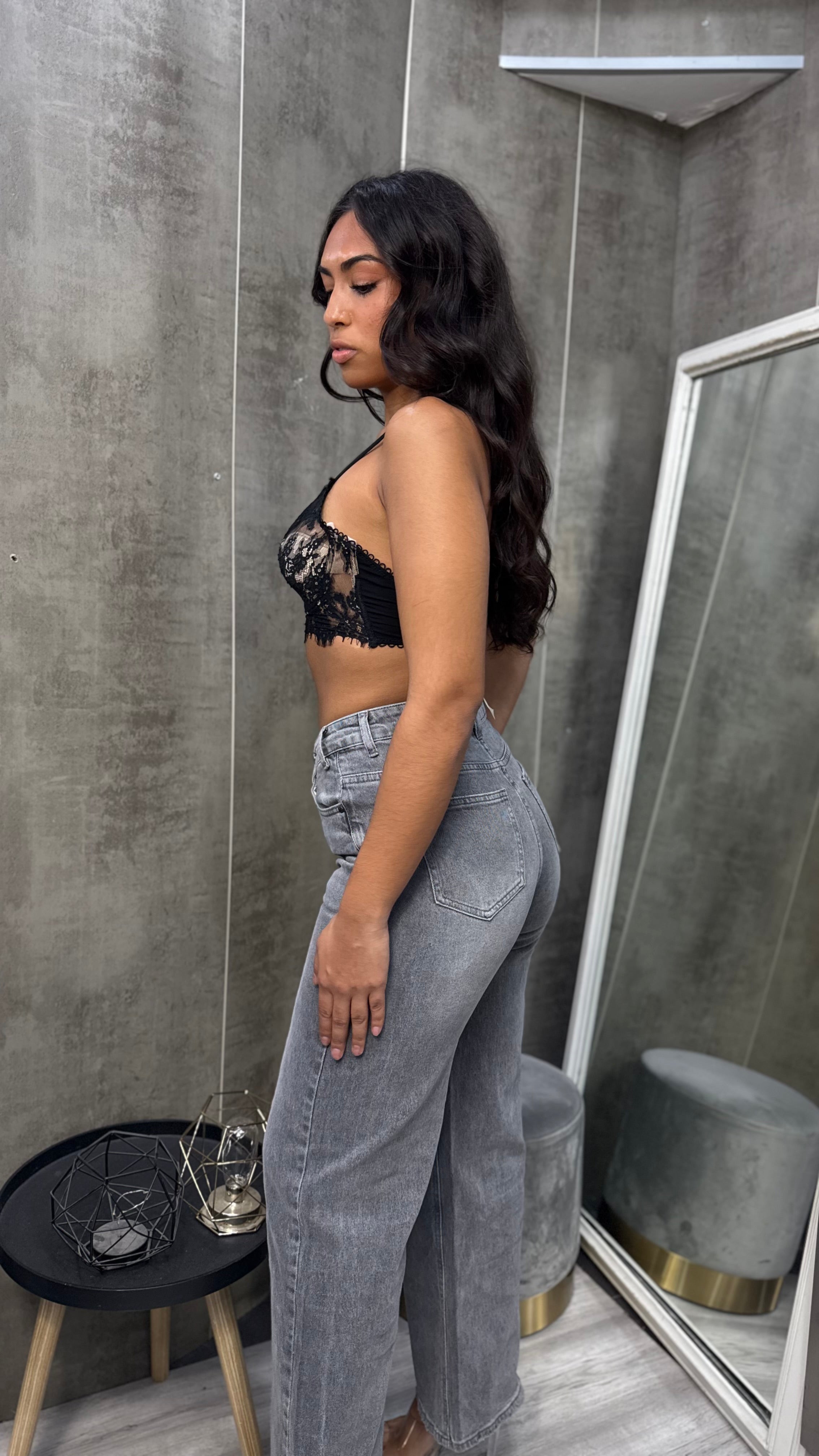 Vaquero gris de tiro alto con diseño cruzado en la cintura y pernera ancha.