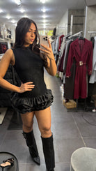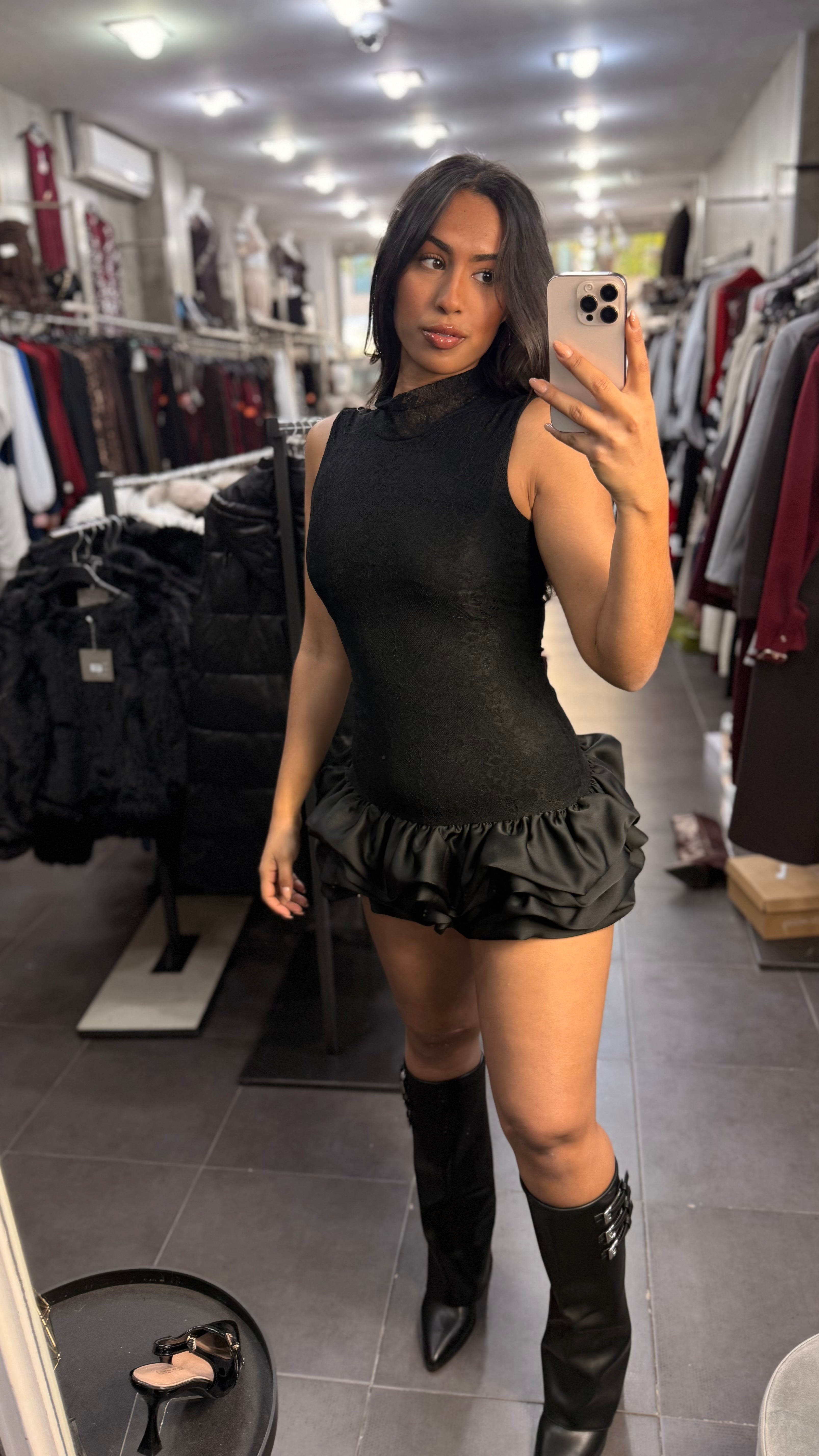 Vestido corto con en la parte superior con encaje e inferior con satén.