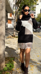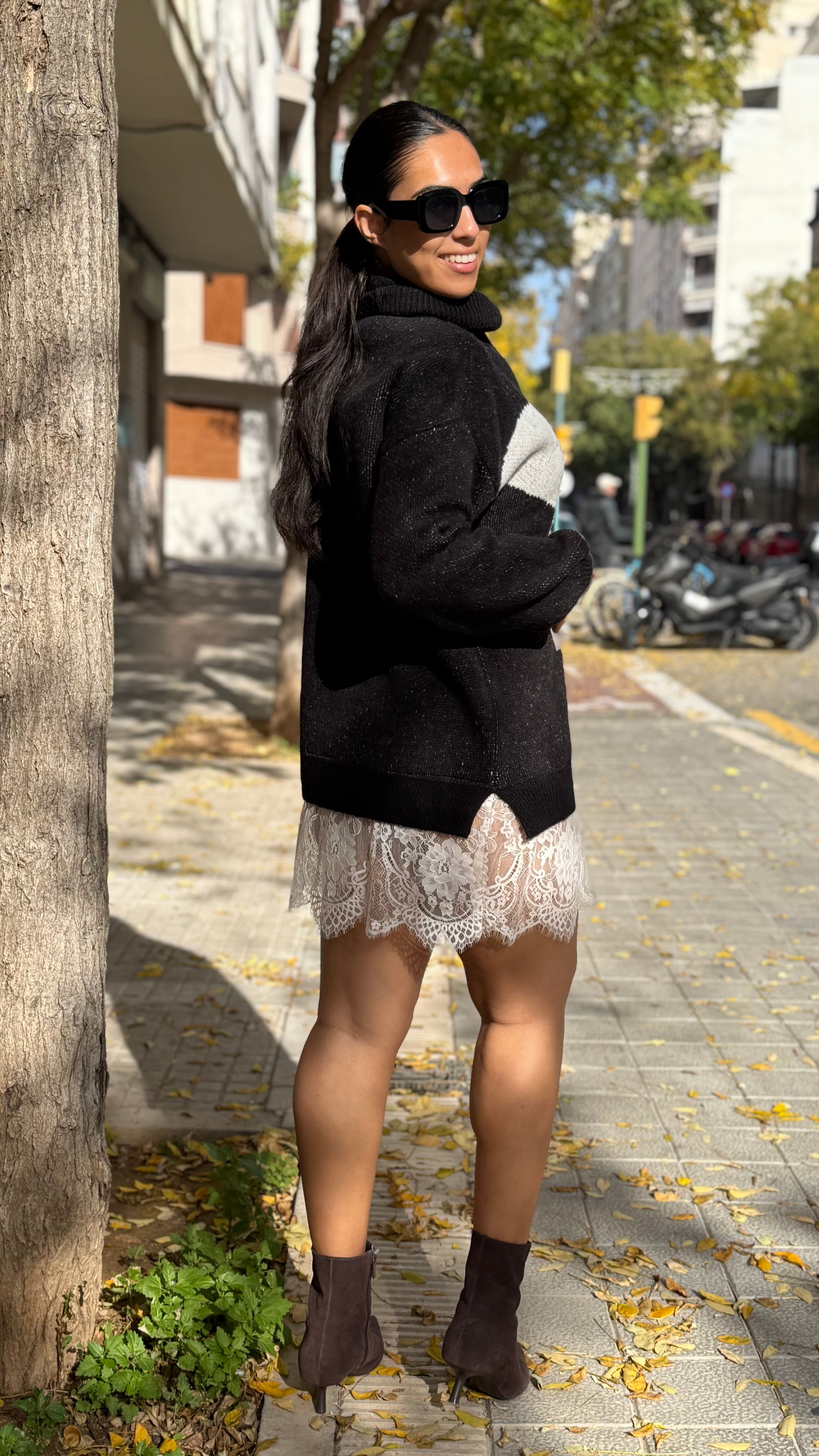 Jersey vestido cuello alto, con detalle de puntilla abajo.