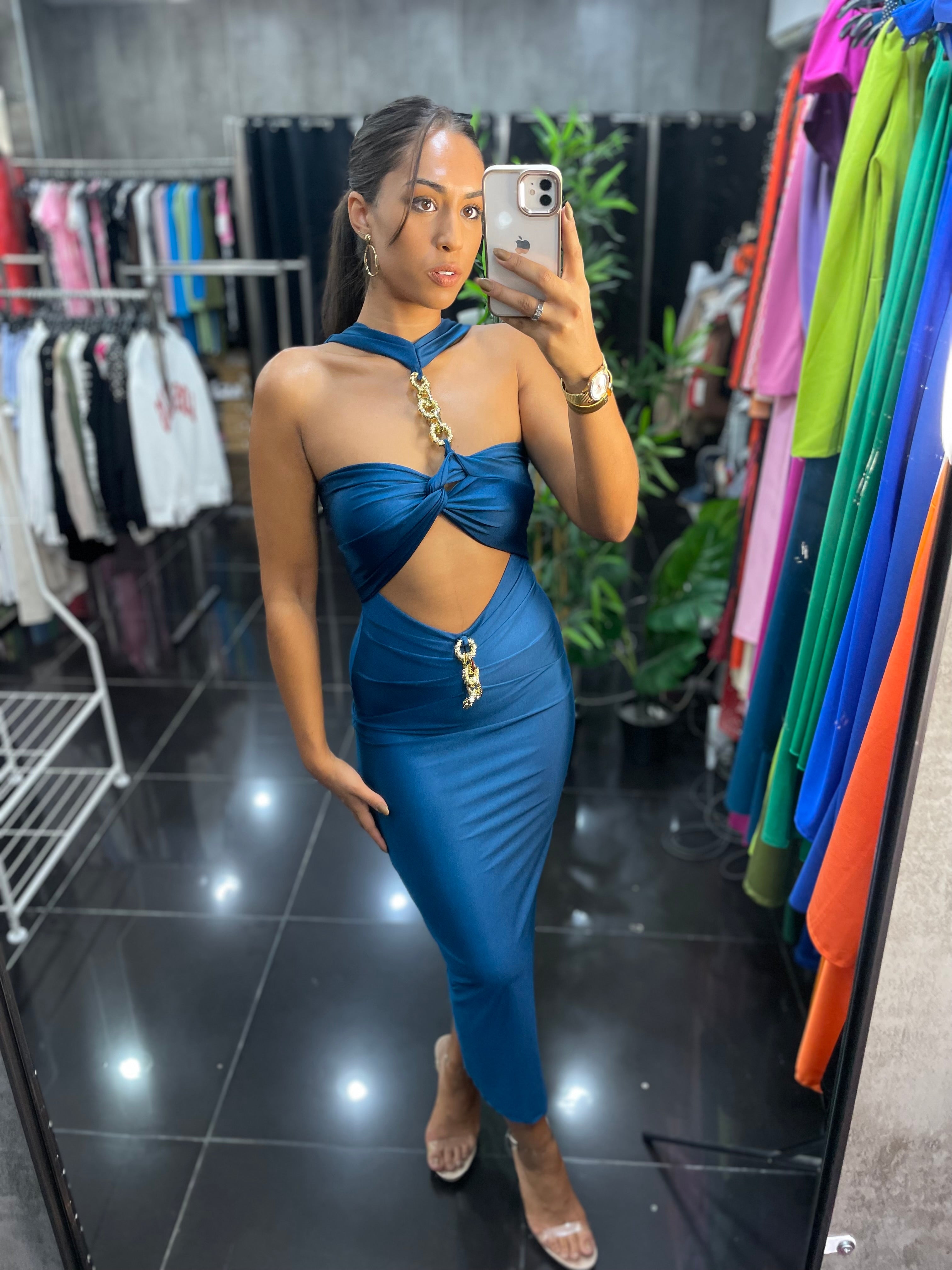 Vestido en licra fría, de corte midi, elegante y sexy al mismo tiempo. Tiene detalle de cadenas en dorado, contiene rellenos en la parte del pecho para mejor sujeción.