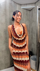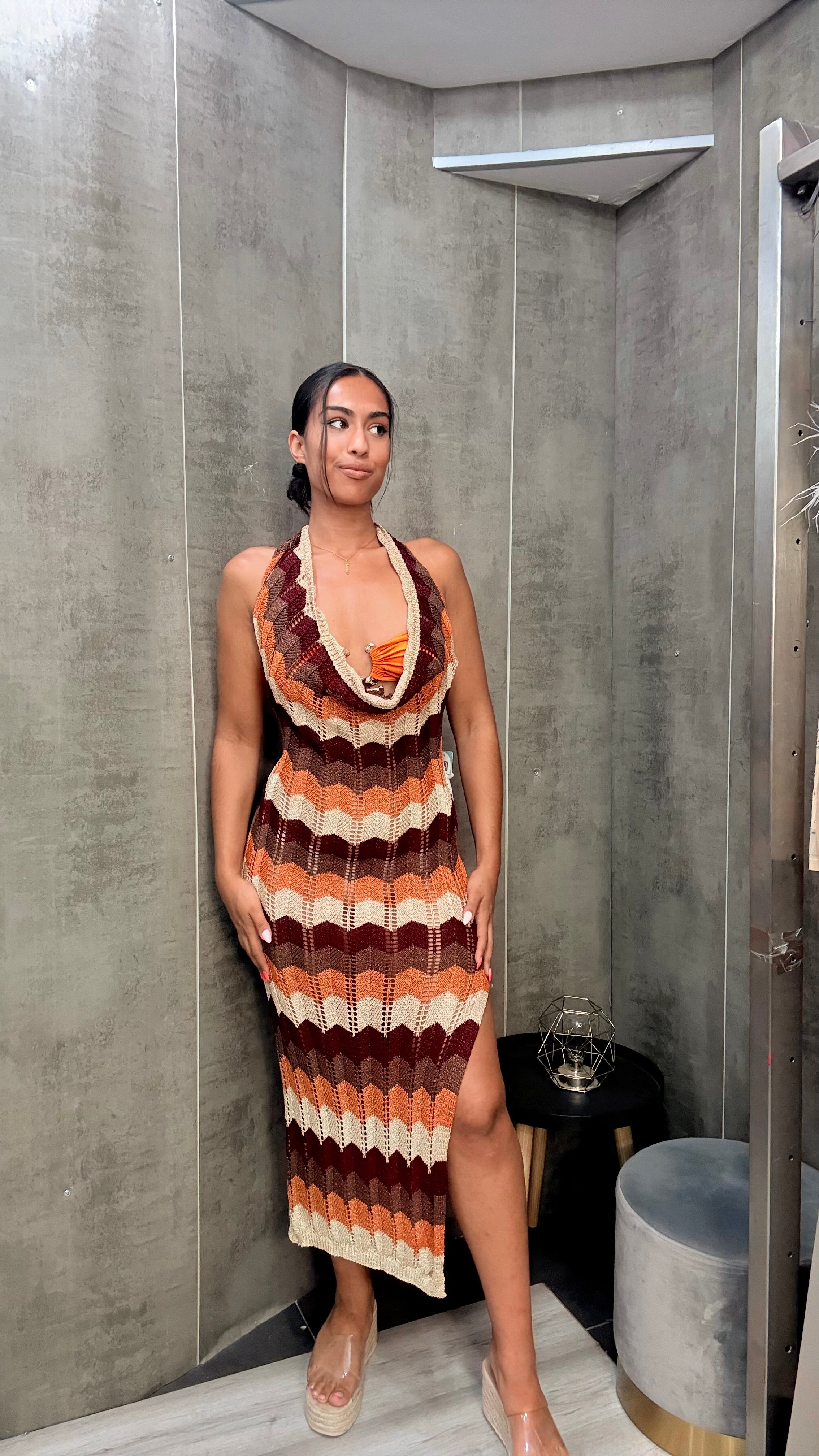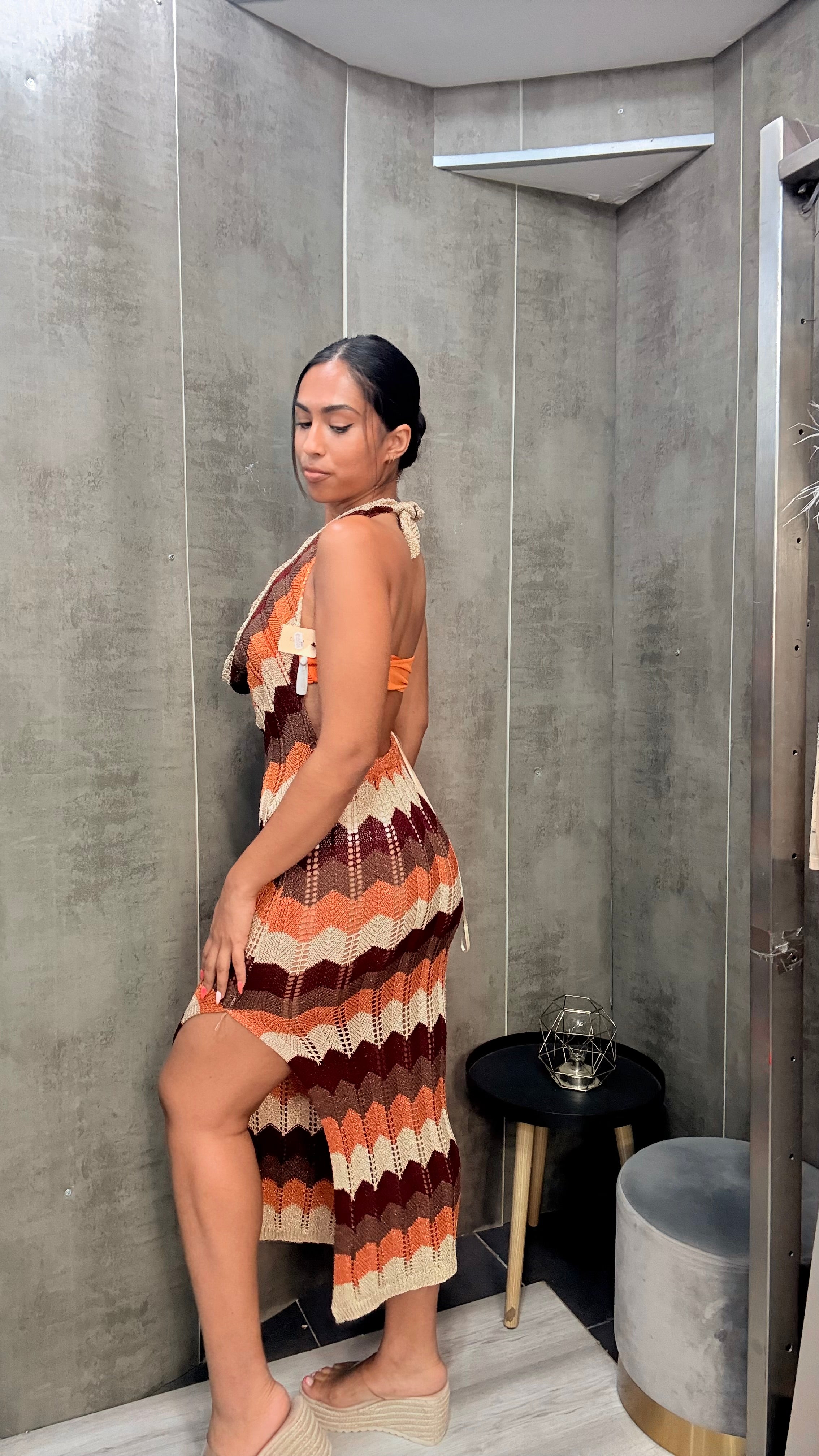 Vestido escotado cogido al cuello, con espalda descubierta.