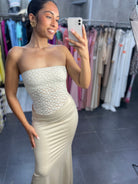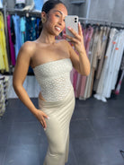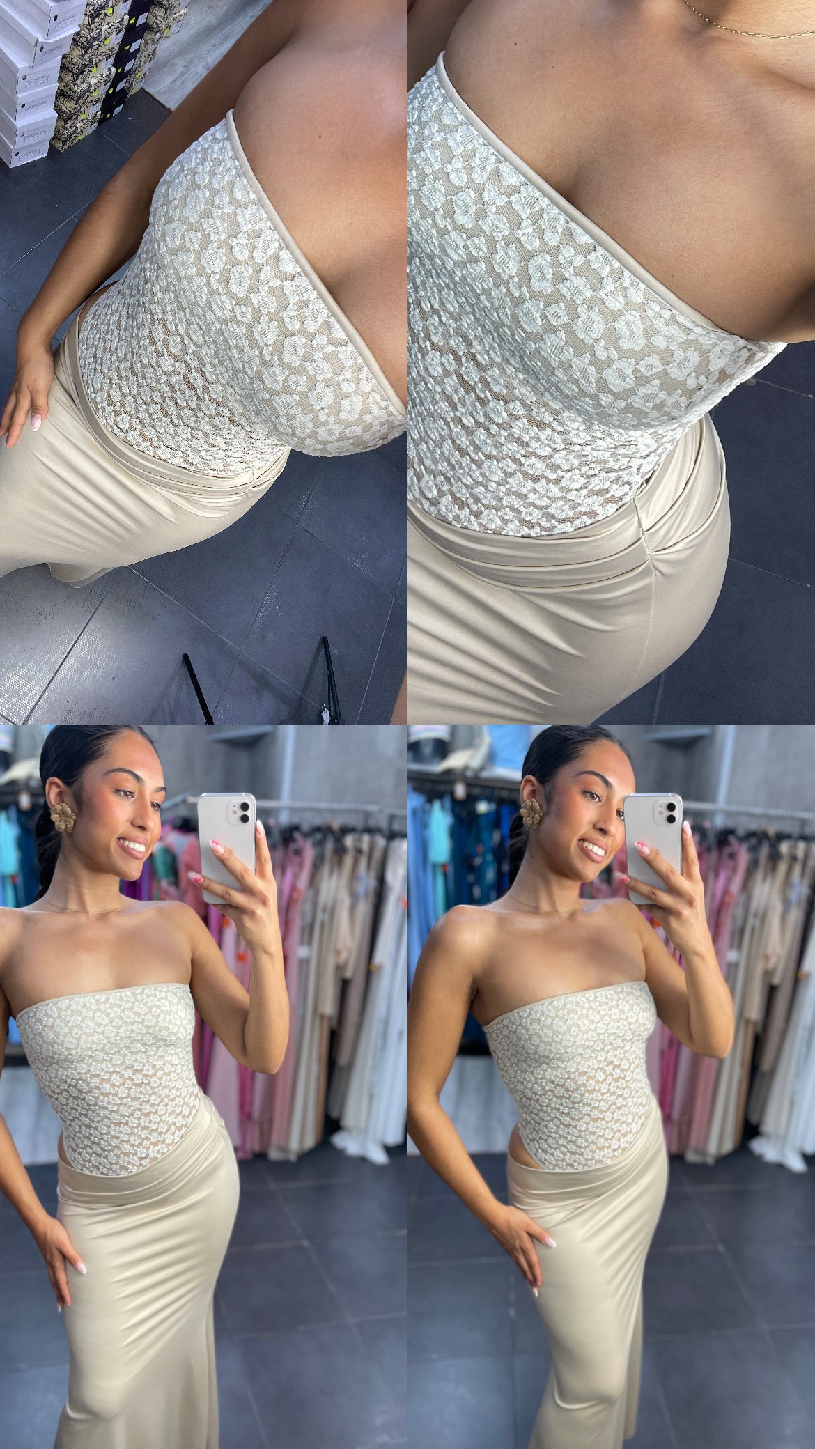 Vestido en la parte de superior con un body de encaje y en la parte inferior en tono beige falda con fruncido.