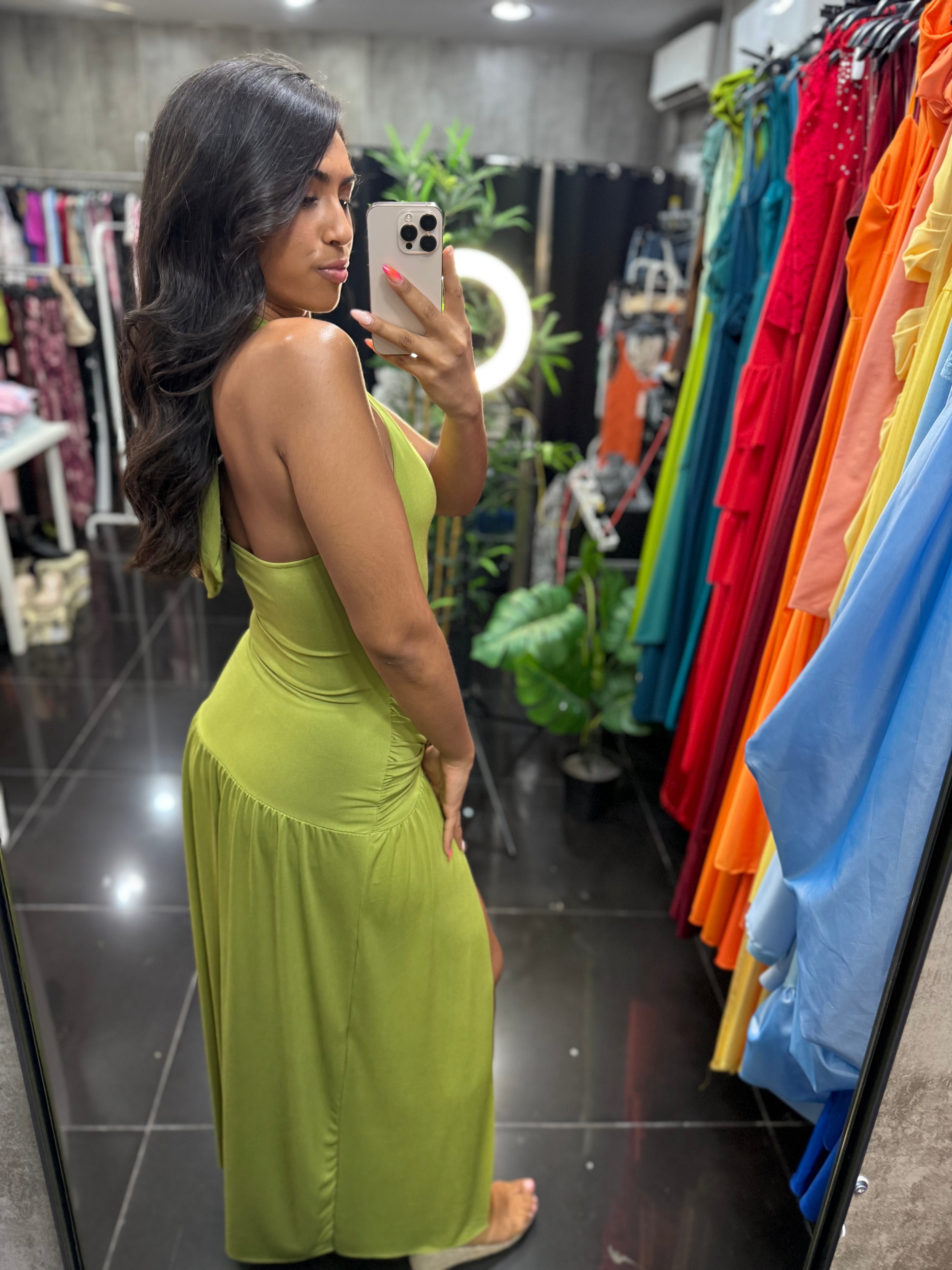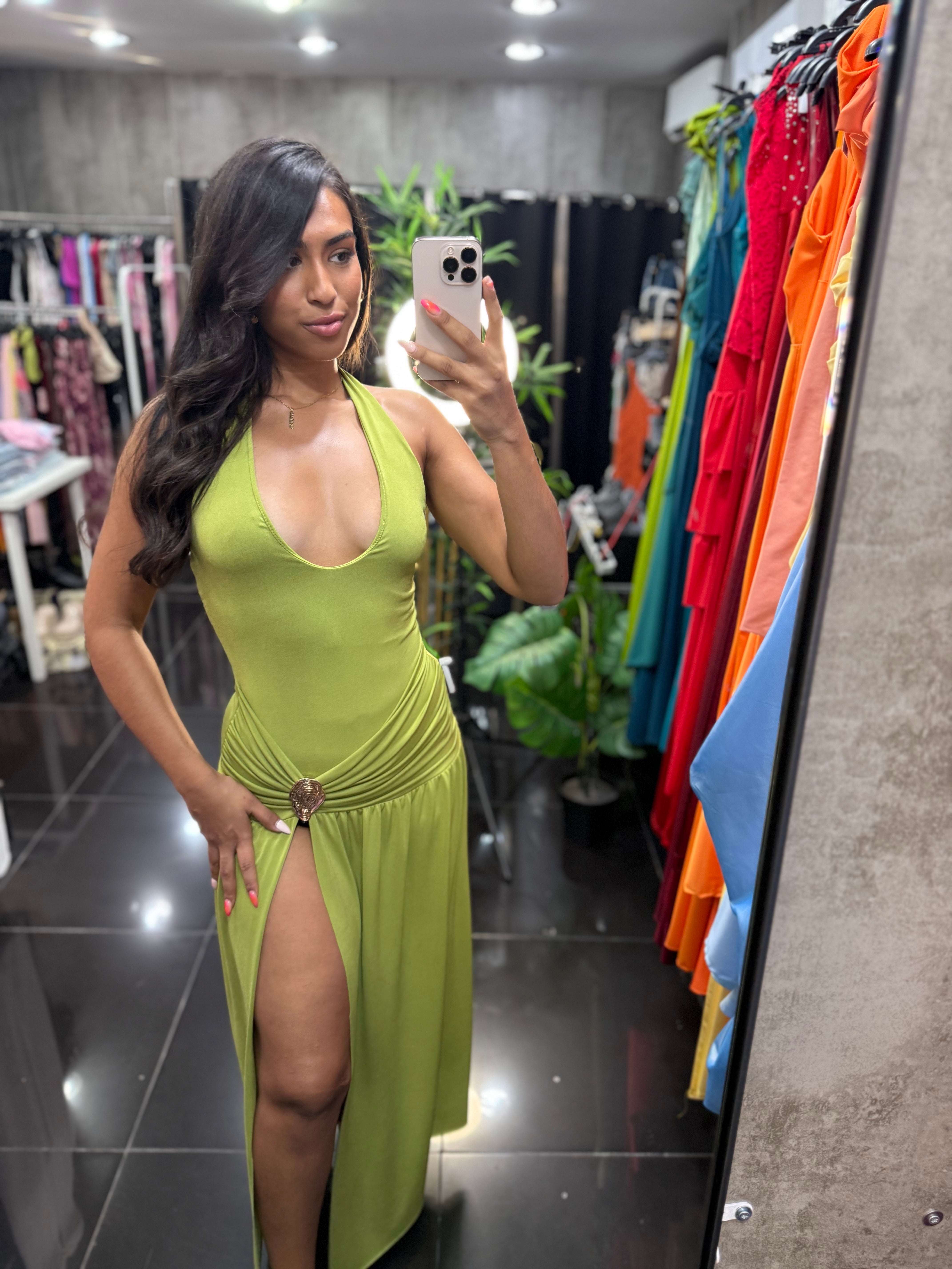 vestido con escote en el pecho y medalla en la lado, con abertura.