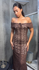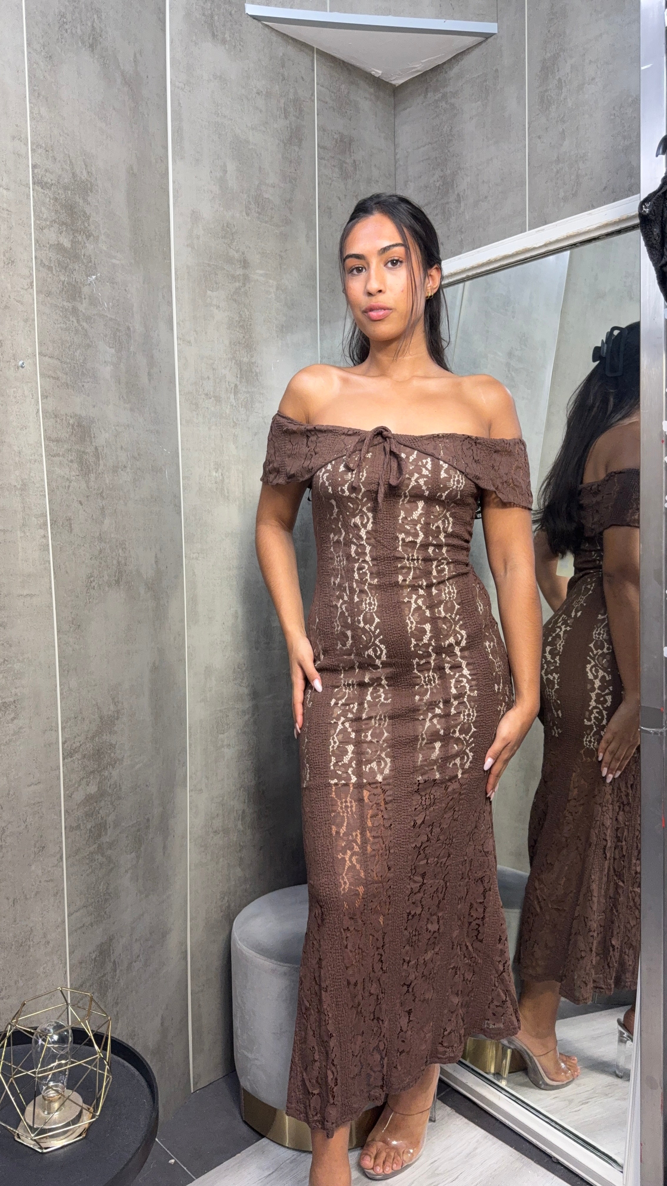 Vestido de palabra de honor con forro corto y tela de encaje con corte sirena.