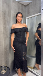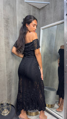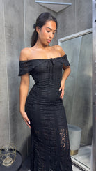 Vestido de palabra de honor con forro corto y tela de encaje con corte sirena.