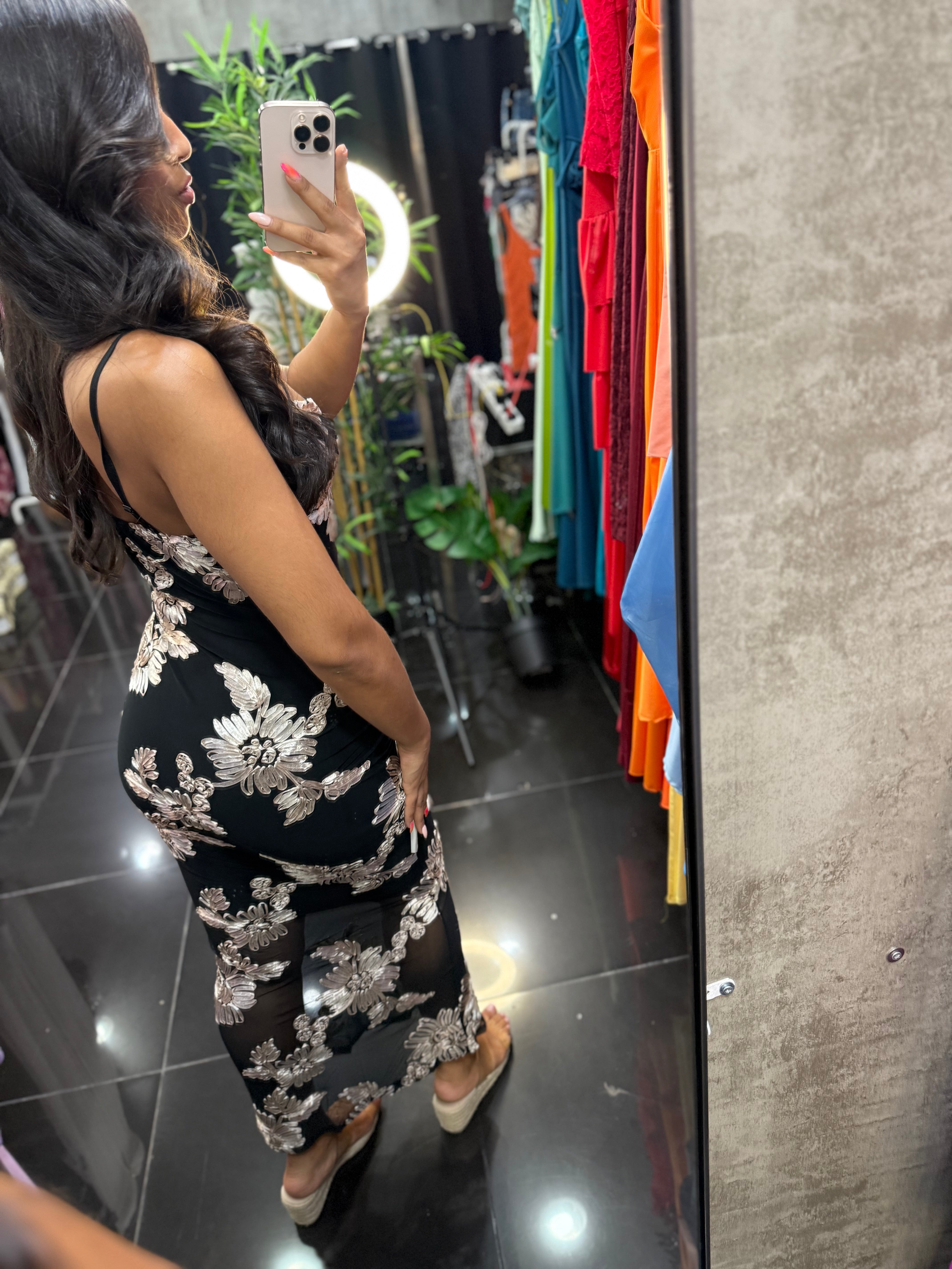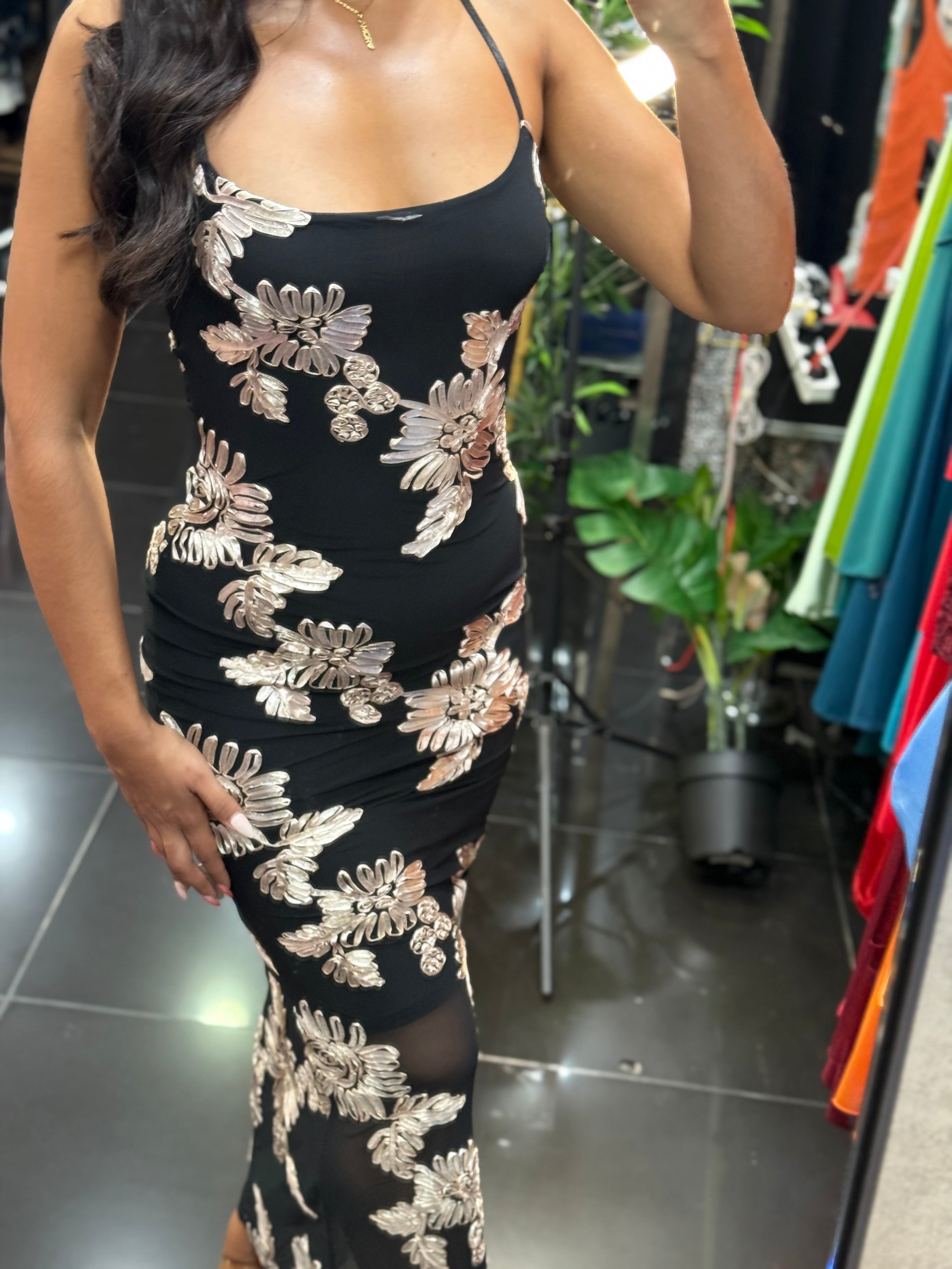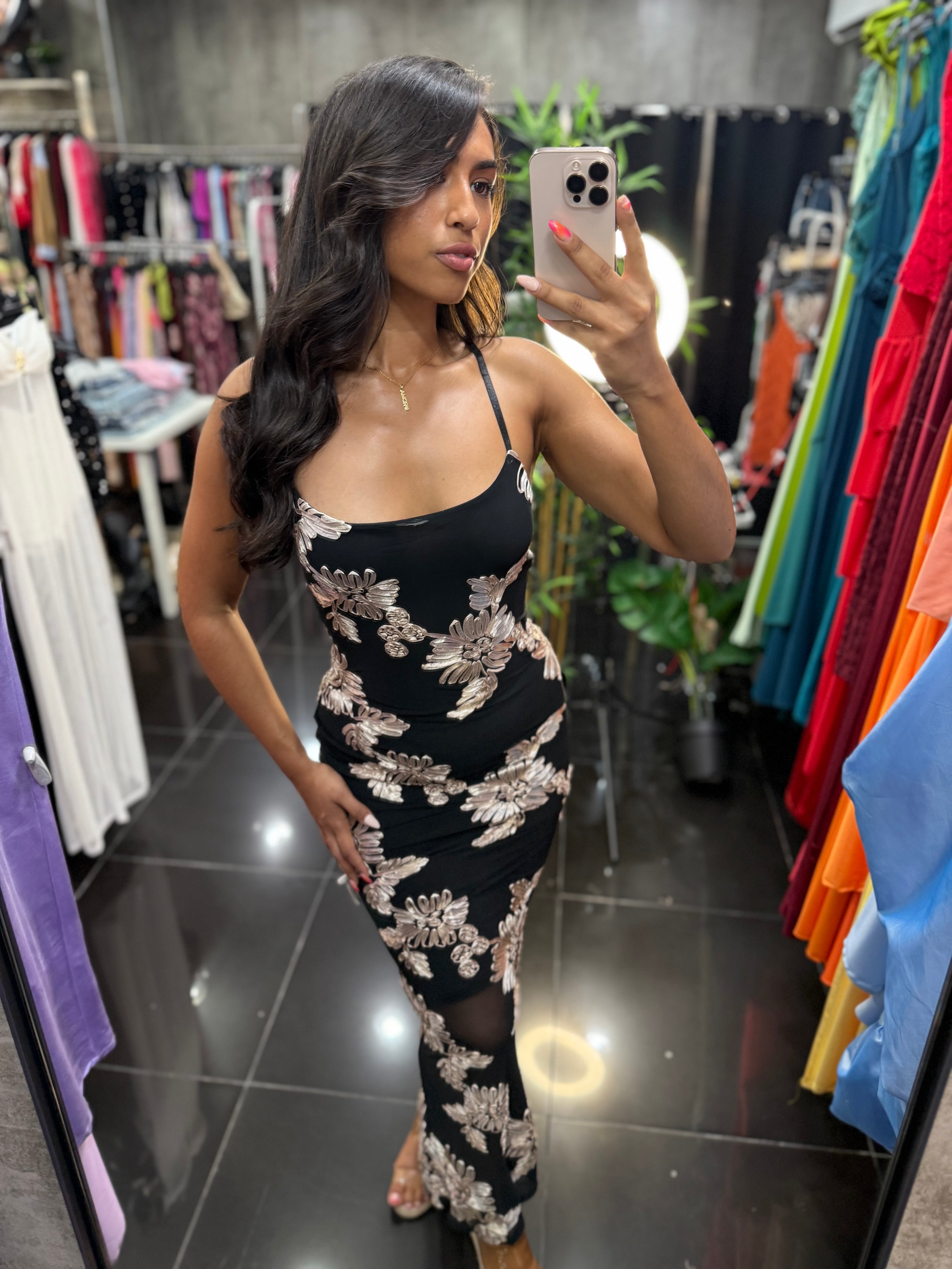 Vestido bordado con flores en fondo negro.