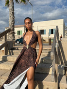 Vestido sin mangas cruzado en la espalda y abertura lateral.