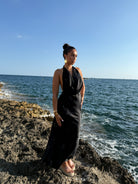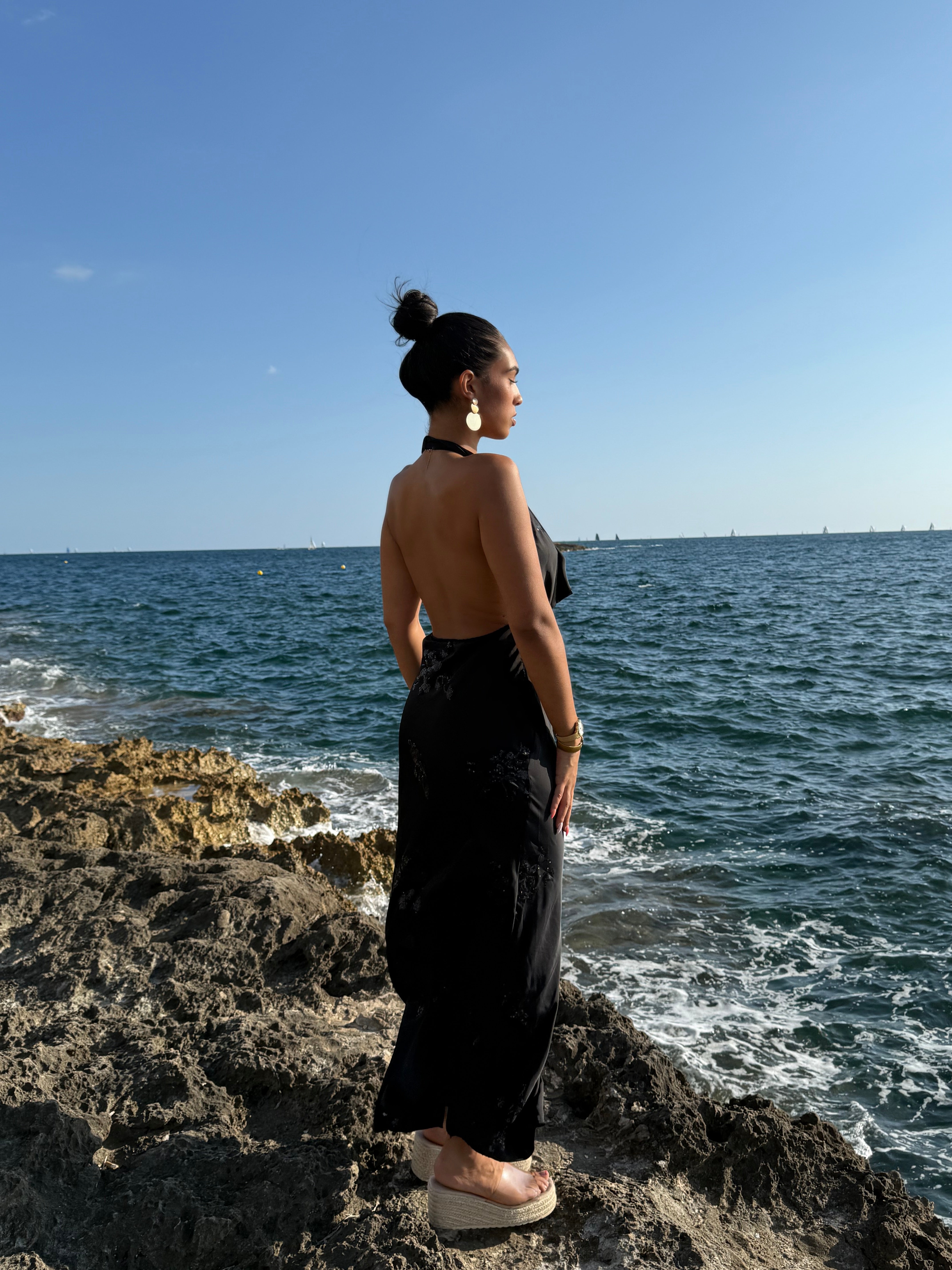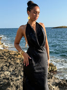 Vestido con escote Halter, con detalles en plateado y espalda al descubierto.